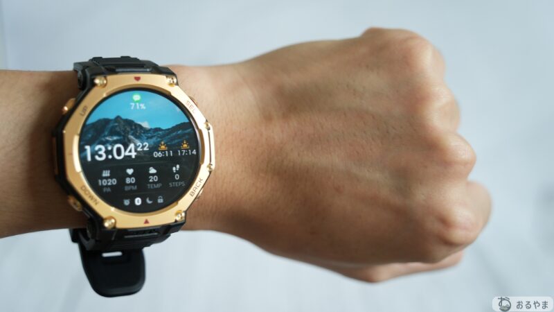 Amazfit T-Rex 3 Proは、本格的なアウトドア向けのウォッチのため、サイズ感はやや大きく、重たく感じます。