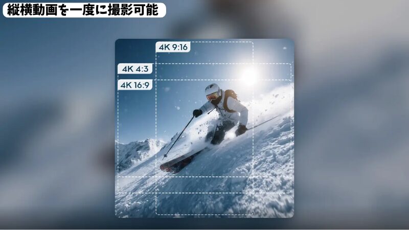 しかし、Action 6なら、3840 x 3840ピクセルのスクエアセンサーで一度撮影するだけで、あとからYouTube用の横動画(16:9)も、TikTok用の縦動画(9:16)も、画質を一切損なわずに(ロスレス4Kで)自由に切り出せます。