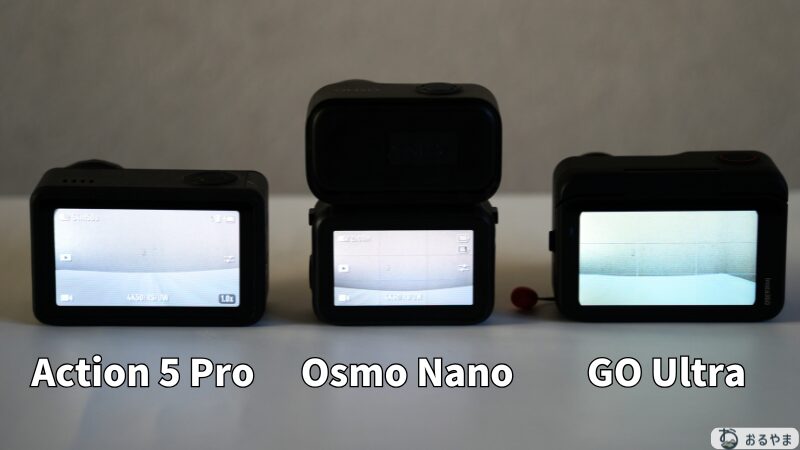 一方で、Insta360 GO Ultraは通常の液晶スクリーンを採用しており、Osmo Nano より視認性は劣ります。