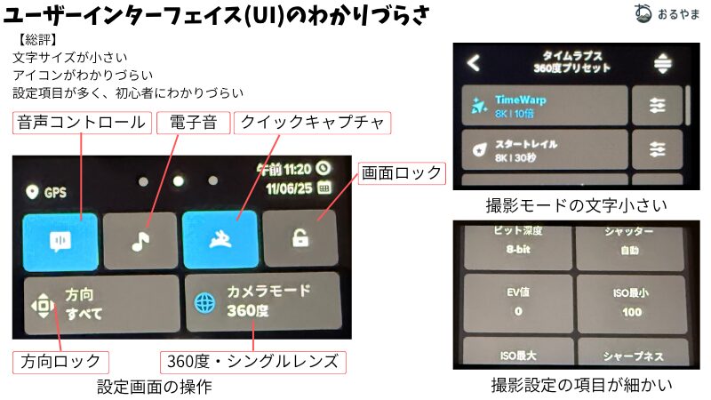 解像度設定や撮影モードの選択、設定画面など、そもそも文字サイズが小さく、視認性が低いです。