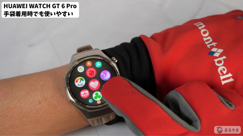 HUAWEI WATCH GT 6 Proのディスプレイやボタン操作は、秋山・冬山用の厚手のグローブを装着していても、タッチ操作しやすかったです。