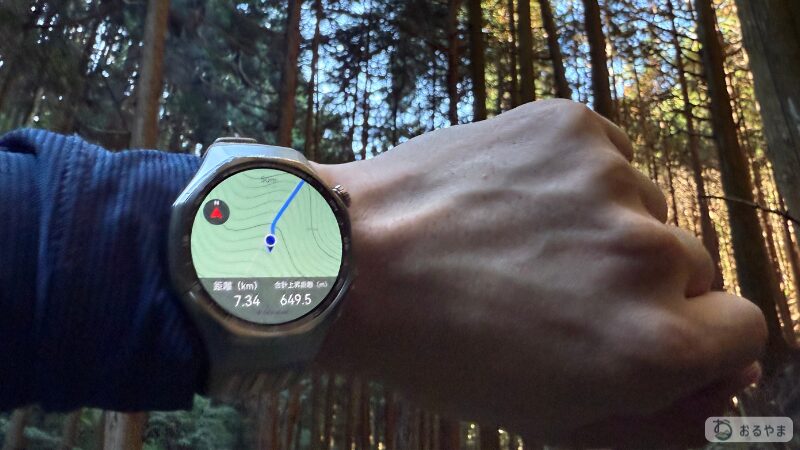 HUAWEI WATCH GT 6 Proの画面上に自分の計画したルートを表示させられるので、分岐や道が不明瞭な場所で、自分がルートから外れていないかを即座に確認できる安心感は高いです。