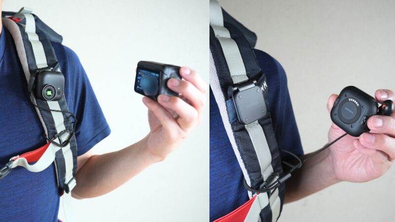 Insta360 GO Ultraの基本的な撮影スタイルは、簡易クリップマグネットをショルダーハーネスに固定して、マグネットで簡単に着脱できるスタイルがおすすめです。