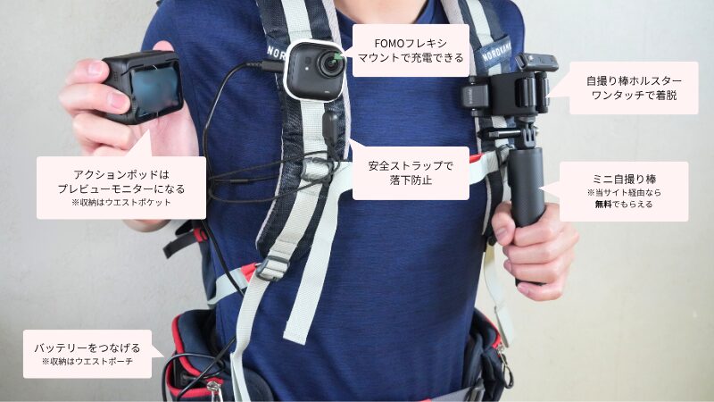 バッテリー切れ対策として、FOMOフレキシマウントを併用することで充電しながらの撮影が可能になります。