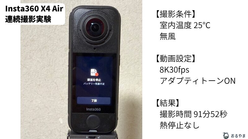 Insta360 X4 Airのバッテリー持ちは、8K/30fpsで約92分間撮影でき、熱停止もなく、X5やX4と同等の撮影時間がありました。