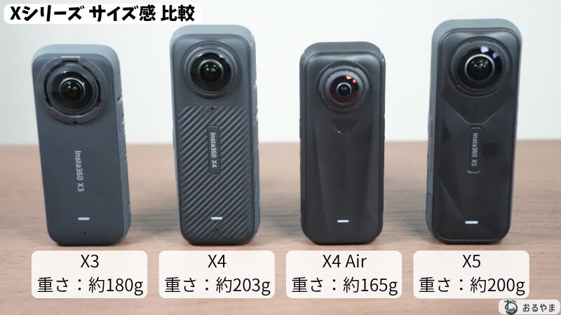 | モデル | ![]() ![]() Insta360 X4 Air | ![]() ![]() Insta360 X5 | ![]() ![]() Insta360 X4 | ![]() ![]() Insta360 X3 |