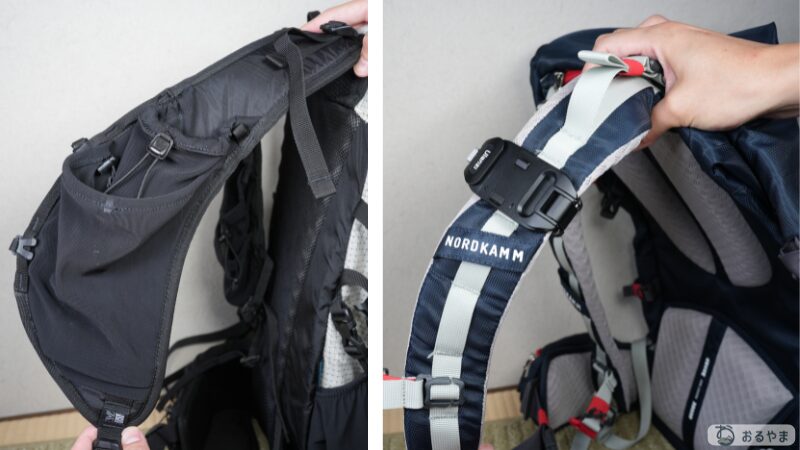 Karrimor Cleave 40のショルダーポケットにボトルを入れると、片方の肩に負担がかかりやすくなります。