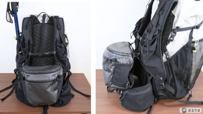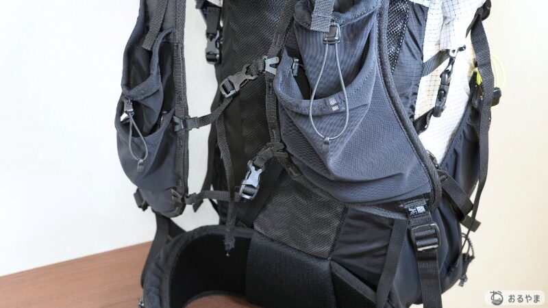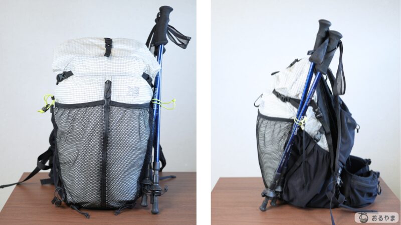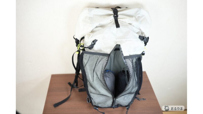 「中に入りきらないなら外に付ければいい」というULの思想が反映されており、フロントメッシュには濡れたテント、サイドにはポール、底面にはマットと、パッキングの工夫次第で無限の収納力を発揮します。