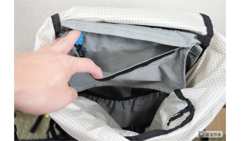 Karrimor Cleave 40には「雨蓋(トップリッド)」が搭載されていないため、レインウェアや財布などすぐに使うものを「とりあえず雨蓋へ収納」することはできません。