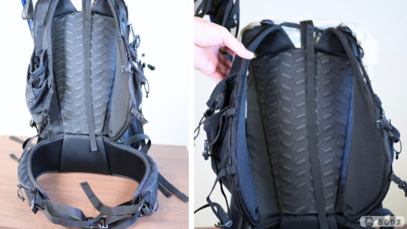 Karrimor Cleave 40は、軽量化のためにショルダーハーネスやウエストベルトのクッション材が薄いデザインになっています。