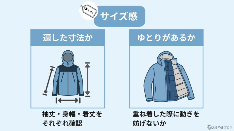 レインウェアを購入する際は、寸法を抑えたうえで、普段よりもゆとりのあるサイズを選ぶのがおすすめです。