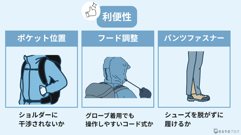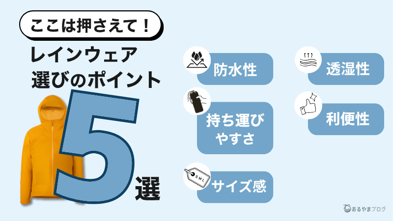 登山用レインウェアを選ぶためには、下記5つのポイントを考慮して選びます。