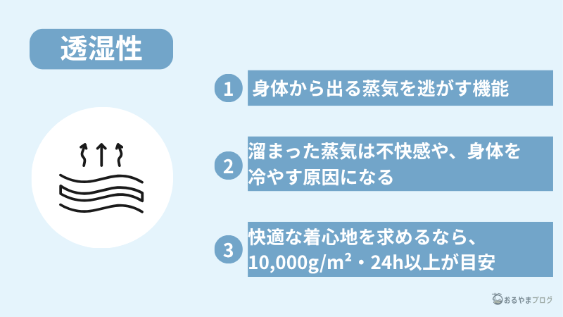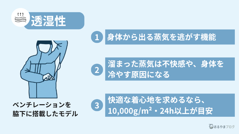 レインウェアを選ぶ際には防水性だけでなく、汗や身体の蒸気を外に逃がす「透湿性」の確認が必要です。