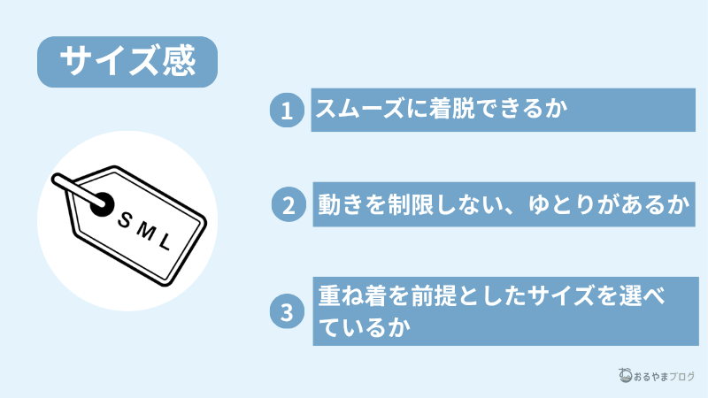 見た目のフィット感だけでなく、重ね着を考慮してゆとりを持ったサイズを選ぶのがおすすめですよ!