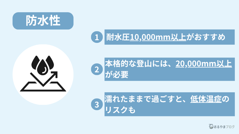 登山用レインウェアの防水性は、日帰りハイキングなら耐水圧10,000mm以上、本格的な登山を想定するなら20,000mm以上がおすすめです。